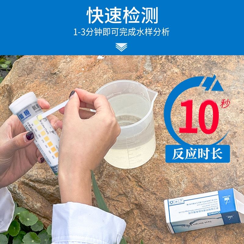 4、将试纸反应区部分浸入待测水样中10秒,取出甩掉多余的水样。
